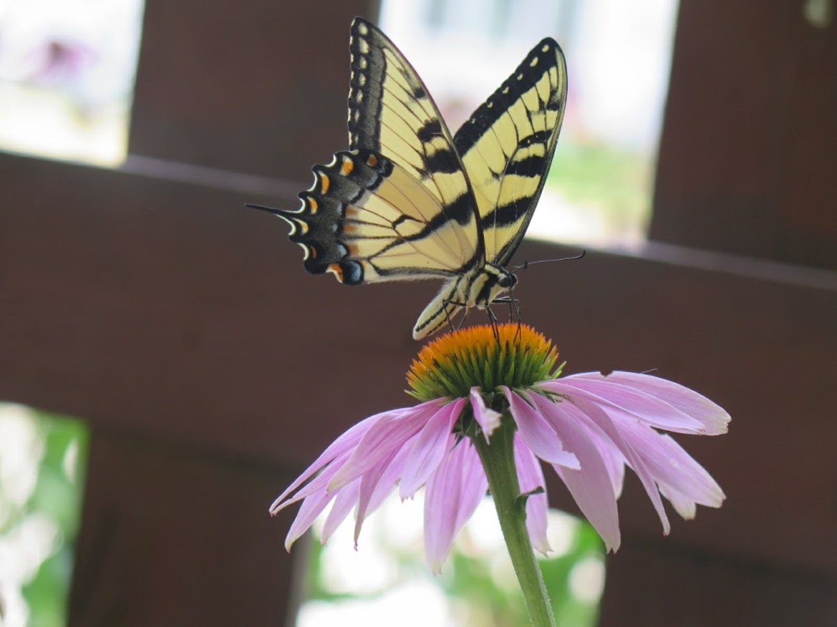 A female Eastern tiger swallowtail yellow morph visits purple coneflower.