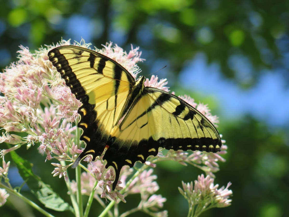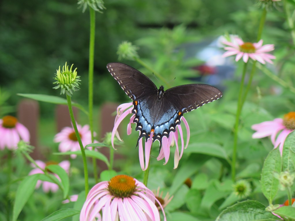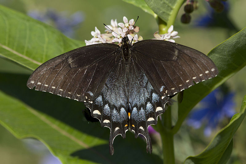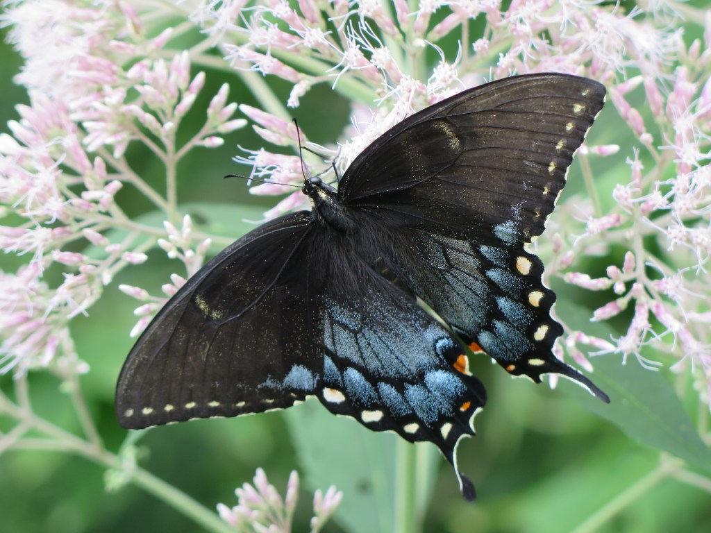 A Female Eastern Tiger Swallowtail blue morph, part of the infamous “North American Mimicry Complex,” visiting Joe Pye weed. Swallowtails seem to love Joe Pye weed.