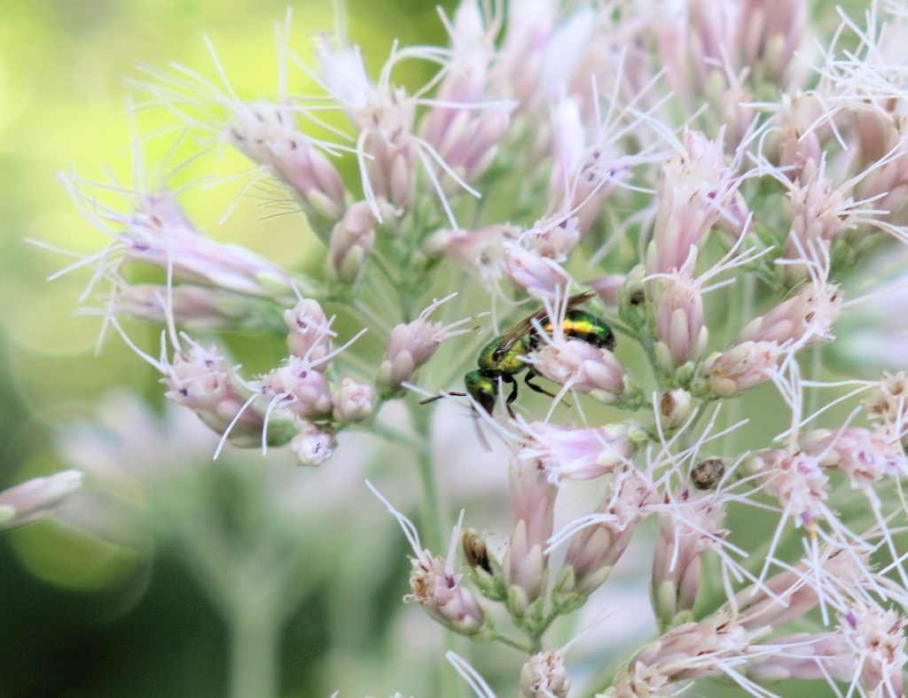 Little green solitary bee, climbing through Joe Pye weed flowers.