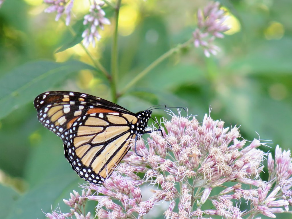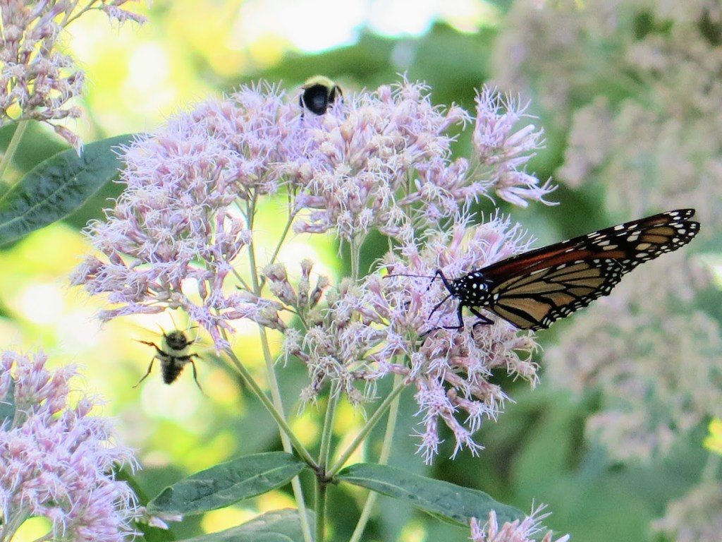 Two bumblebees and a monarch walk into a bar… just joking! This is sweet Joe Pye weed (Eutrochium purpureum).