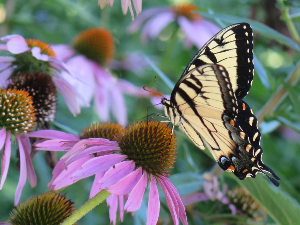 Beautiful female tiger swallowtail on beautiful coneflowers.